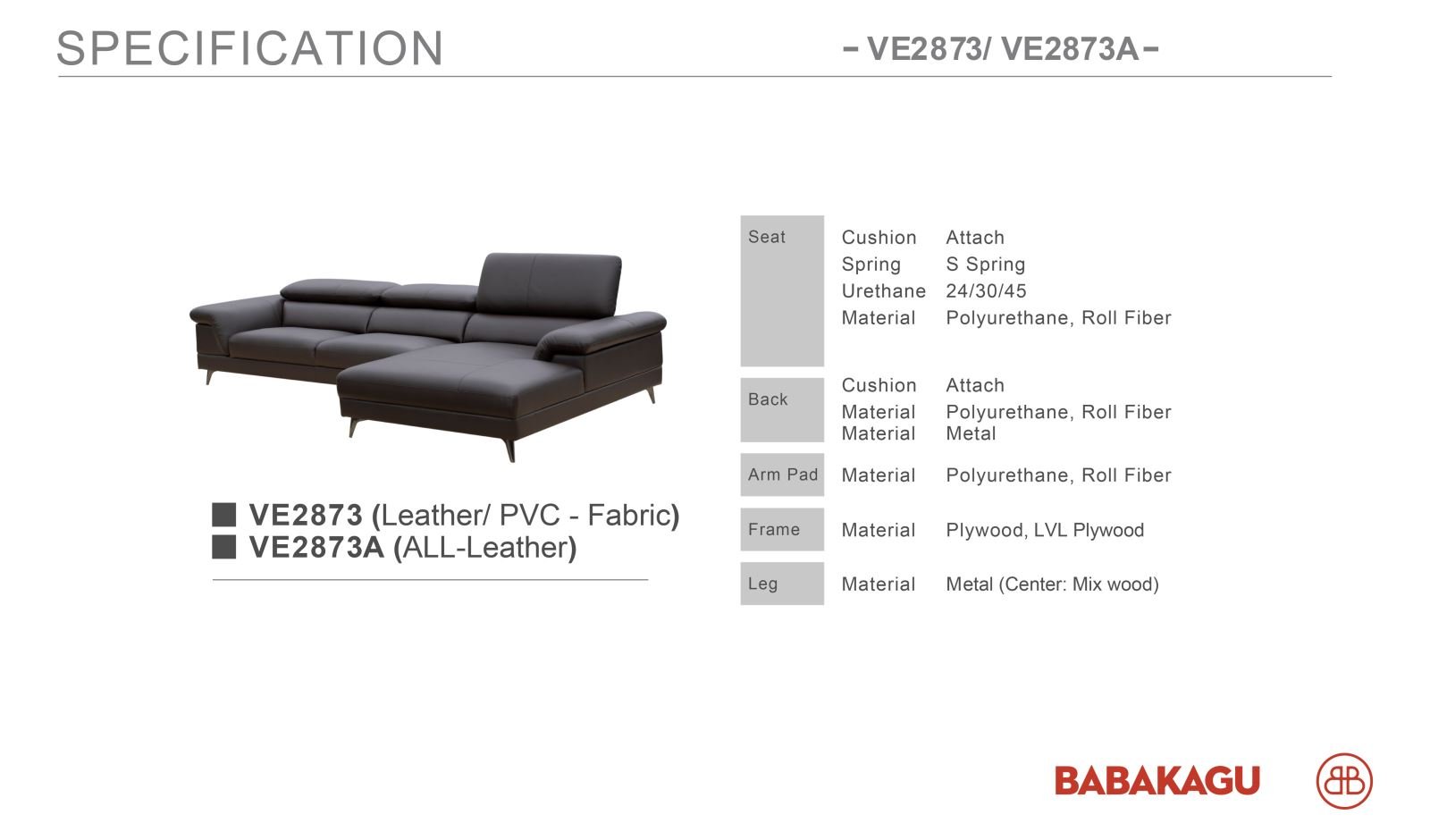 Chất liệu: Phiên bản VE2873 kết hợp Leather/PVC-Fabric, phiên bản VE2873A bọc toàn bộ da cao cấp (All-Leather).